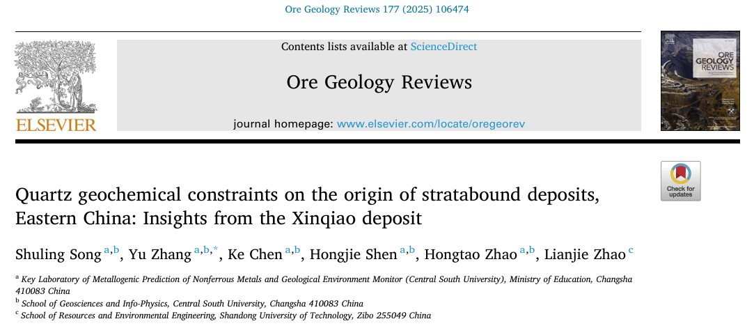 近日,有色金属成矿预测与地质环境监测教育部重点实验室(中南大学)在Ore Geology Reviews期刊发表了题为“Quartz geochemical constraints on the origin of stratabound deposits, Eastern China: Insights from the Xinqiao deposit”(《石英地球化学层状矿床成因的制约:来自中国东部新桥矿床的启示》)的最新研究成果,该研究结果突显了石英内部结构和微量元素地球化学在揭示矿化过程中的应用价值,并为长江中下游成矿带层状矿床及全球类似成矿环境中的矿床成因提供了新的见解。