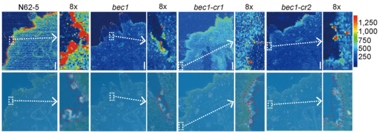 •突变体bec1因BEC1基因功能缺失,腺毛表面硅信号几乎消失,证实硅转运与“白霜”形成的直接关联(图1)。