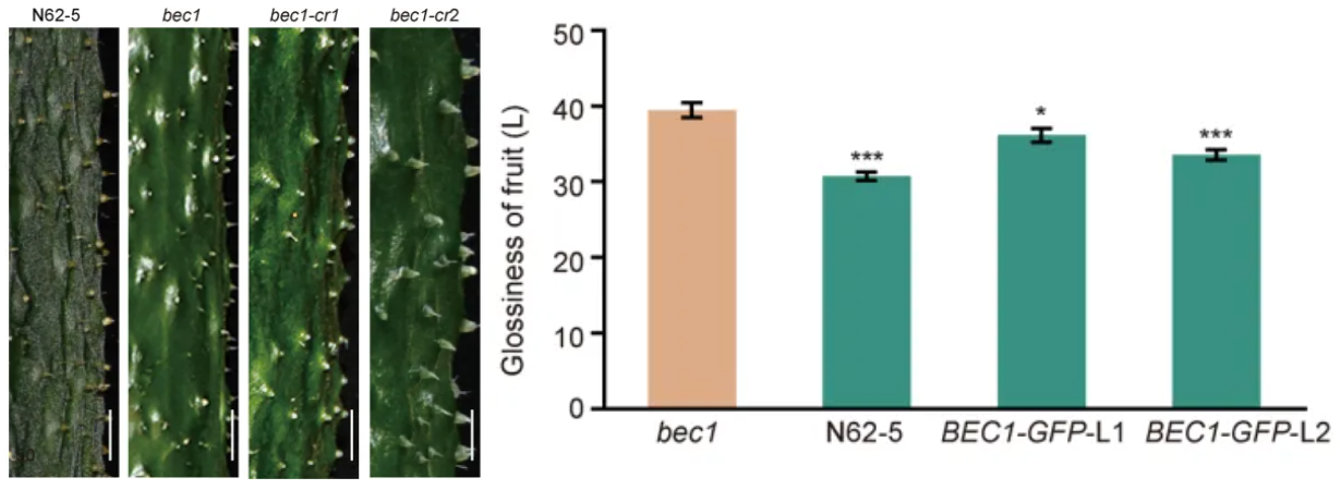 •基因编辑突变体(bec1-cr1/cr2)因BEC1蛋白提前终止,导致硅吸收量下降80%以上,果实表面无白霜且光泽度显著提升(图3、4)。