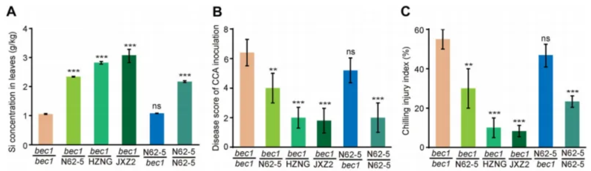 •突变体bec1因硅缺乏,对Corynespora cassiicola菌和低温胁迫的抗性显著下降;