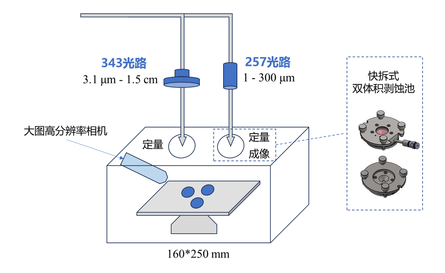 257光路:专为极致“冷剥蚀”设计,光斑1-300 μm连续可调(可升级至0.5 μm),配备两种快拆式剥蚀池: